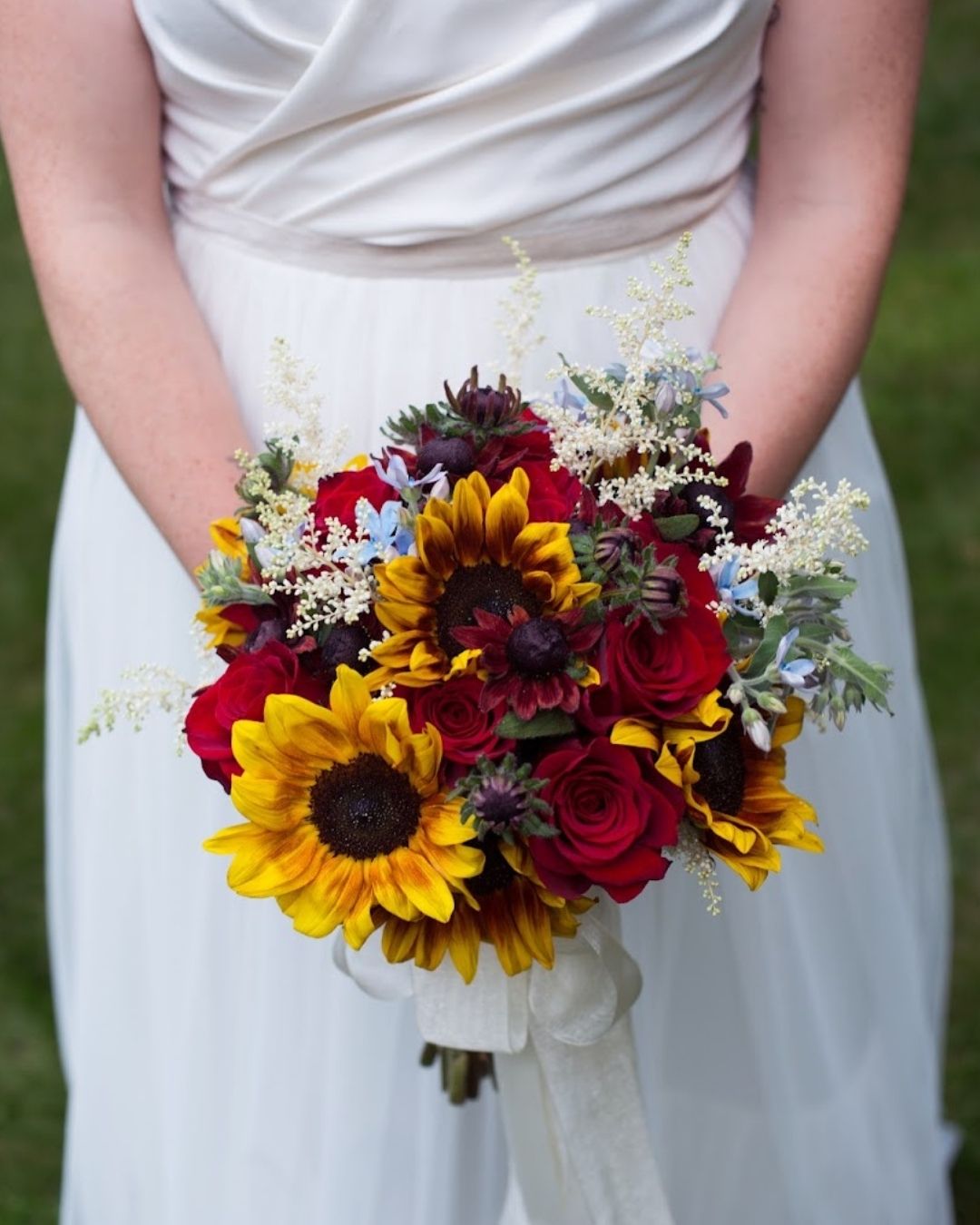 This bouquet features sunflowers and burlap. A gorgeous and colorful wedding bouquet of yellow and lilac roses red and pink blooms sunflowers billy balls white flowers and greenery. 896 3900 FREE shipping.